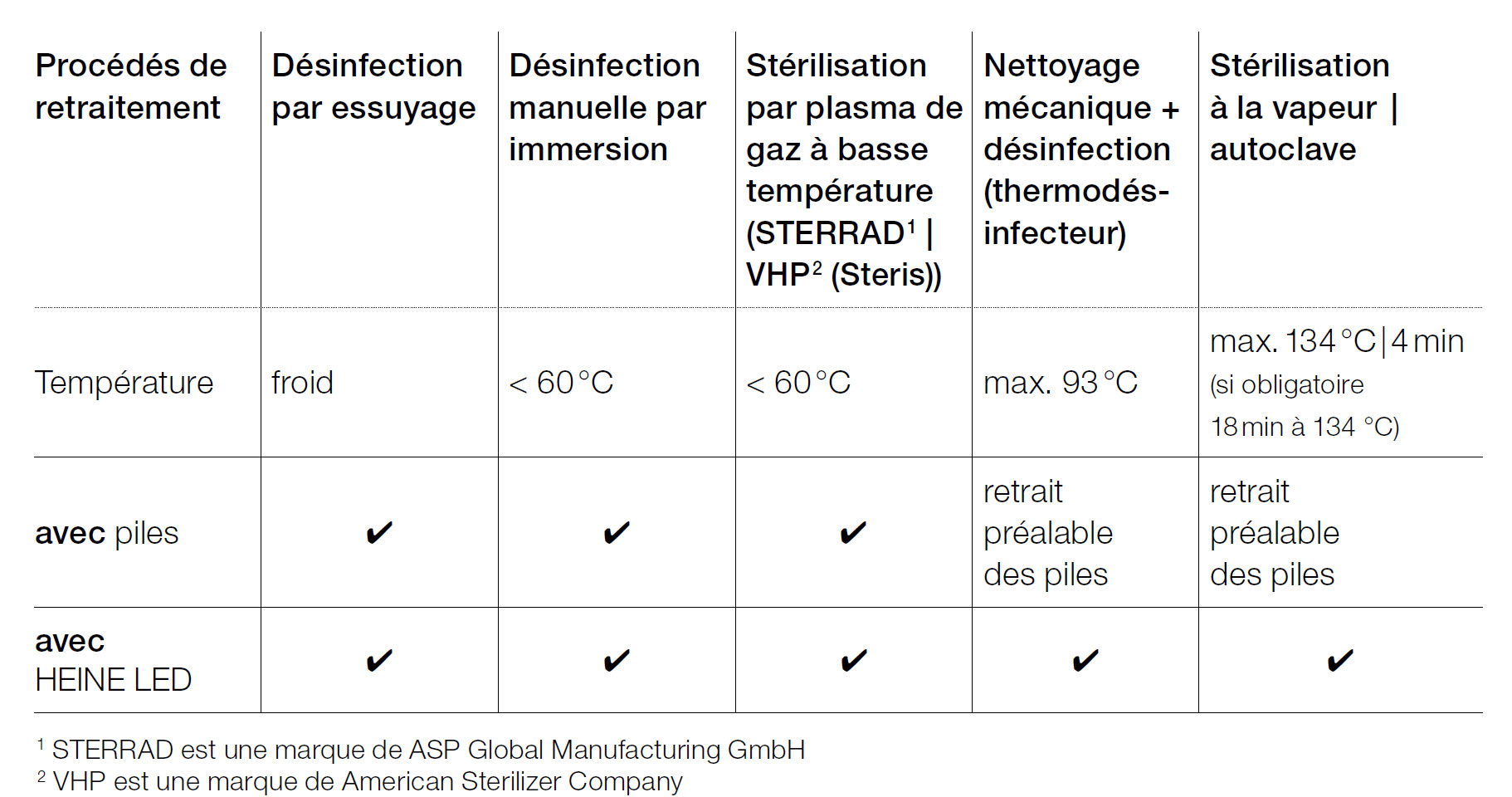 - 100 % étanche à l’eau. Pour la désinfection par immersion (haut niveau de désinfection) ou les procédés de stérilisation basse température (STERRAD 1, VHP 2 (Steris)), il est inutile d’enlever les piles et l’unité d’éclairage à LED